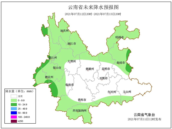 7月11日20时-7月12日20时: 昭通北部、怒江、保山北部、德宏西部多云间阴有小到中雨局部大雨,昭通南部、曲靖北部、昆明北部、楚雄北部、丽江、迪庆、大理西部、保山东部、德宏东部、临沧西部、普洱南部、西双版纳、红河南部、文山西南部多云有阵雨局部中雨,其它地区多云间晴。