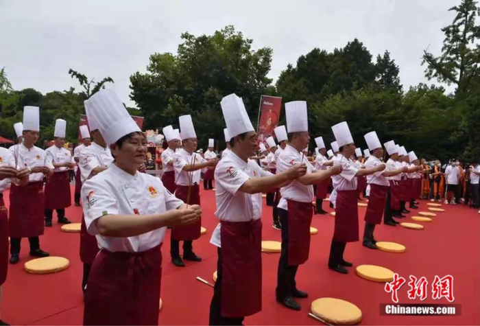 现场,数百名烹饪大师统一着装,整齐列队,行叩拜大礼,声势浩大,庄严肃穆,十分壮观。