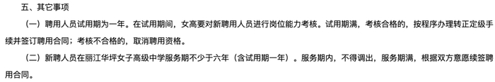 值得注意的是:①报名采取现场报名方式;②聘用人员试用期为一年。在试用期间,女高要对新聘用人员进行岗位能力考核;③新聘人员在丽江华坪女高服务期不少于六年(含试用期一年)。
