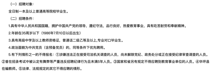 公告显示,此次招聘岗位分别是:高中语文教师2人、数学教师2人、英语教师2人、政治教师2人、历史教师2人、地理教师2人、物理教师2人、化学教师2人、生物教师2人。