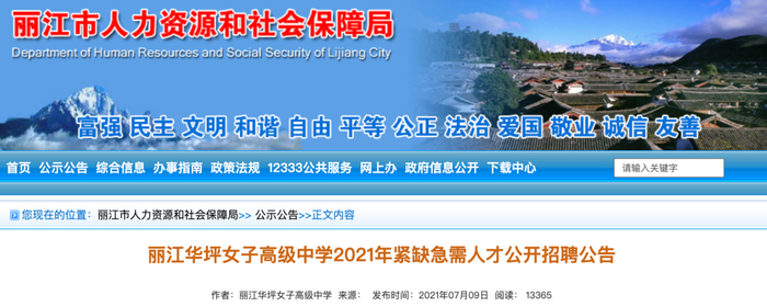 7月9日,云南省丽江市人力资源和社会保障局官网发布公告,丽江华坪女子高级中学面向全国招聘紧缺急需专业技术人才18名,受到社会关注。