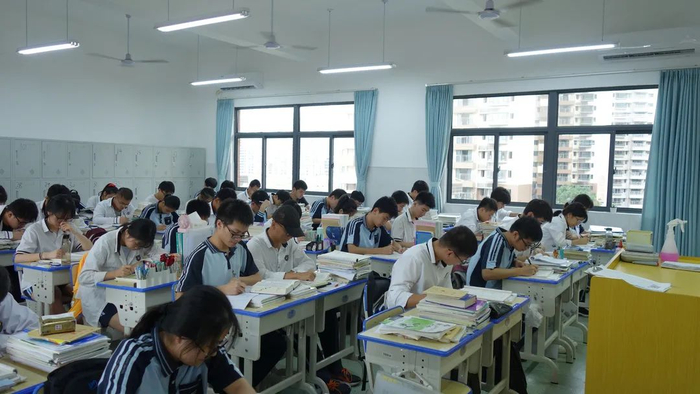 炎炎夏日,同学们在宽敞明亮、凉爽舒适的空调教室里认真学习