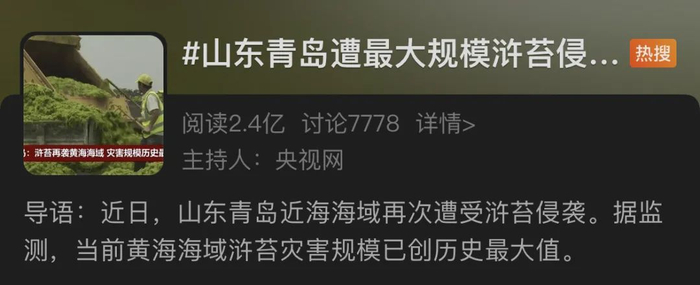 此次“青”岛冲上热搜,是因为这是当地近海历史上遭遇的最大规模浒苔侵袭。根据自然资源部北海预报中心监测,此次浒苔绿潮灾害,对青岛的影响还将持续到8月中旬。