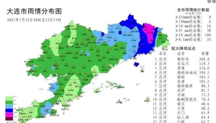 东北部地区可达暴雨、局部大暴雨。预计13日15时至15日8时,我市仍有阵雨或雷阵雨。金普新区东北部、瓦房店中部和北部、普兰店大部、庄河、长海降雨量可达50~100毫米,其中庄河东部和北部个别乡镇降雨量可达100~150毫米;市区北部和东部、金普新区大部、瓦房店南部、普兰店西南部、长兴岛降雨量25~50毫米;其它地区10~25毫米。