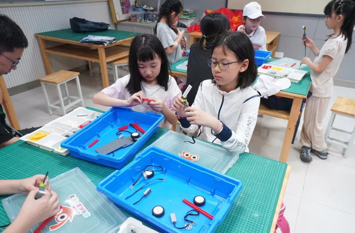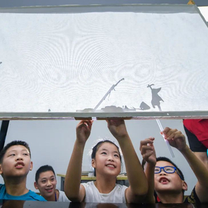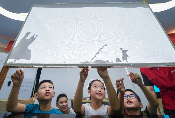 7月8日,学生们用自己制作的皮影作品进行趣味表演。徐昱摄(新华社)