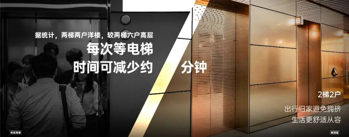 以最常见的普通高层为例,2梯4户高层,33层,共计户数132户,以一家三口常住计算,共计396人,相当于198人共用一部电梯。对比纯正2梯2户16层的板楼,整栋楼仅32户,96人,仅48人共用一部电梯,电梯使用率仅为高层的24%。电梯运行时间更短,楼层停靠频次更少,可以为上下班出行的高峰期,节省更多的时间。有数据显示,2梯2户等电梯的时间,比高层少约7分钟,使用不会那么紧张。