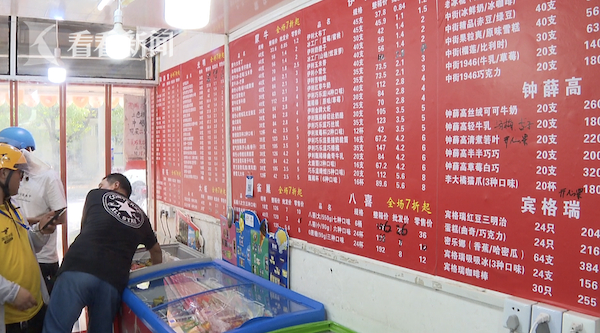 老板介绍说,全站每日总销售100多箱。站内冰柜塞满各类冷饮,从上海人从小吃到大的盐水棒冰到当前流行的网红冰淇淋都有。来此购买的多是老顾客。他们手拿纸箱,看着墙面400多种冷饮的价格表,自主搭配。赤豆棒冰、绿舌头、可爱多,顾客周彦童挑了二十根冷饮,结账价格32元。