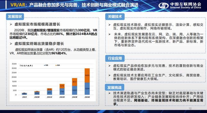2020年AR市场规模约为300亿,VR市场规模约230亿元,市场占比约80%,预计到2024年AR的占比将超过VR。虚拟现实技术也面临着技术演进轨道与产业生态尚未定型,缺乏对底层基础与关键性技术的研发投入,产业链发展短板尚待需要补足,产业结合度不足是发展中的新挑战。