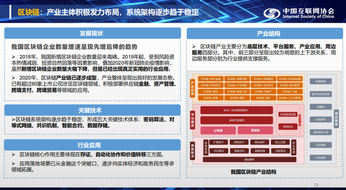 2020年我国区块链产业链已逐步形成,产业整体呈现良好的发展态势,虽然新增区块链企业的数量大幅度下降,但是已经出现了真正的实用的行业应用,截止到目前,已有超过80家上市公司涉足区块链领域,积极推进部署供应链包括金融、资产管理、跨境支付、跨境贸易等领域的应用。