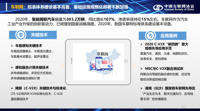 2020年智能网联汽车的销量超过了303万辆,同比增长了107%。车联网为汽车工业产业的升级提供了驱动力,已被提到国家战略的高度,我国车联网标准体系建设已经基本完成。随着车联网技术及应用的日益普及,智能化交通已成为必然的发展趋势。我们认为车联网先导应用应该是在自动出车、自动停车、高速路自动驾驶、特定区域的自动驾驶等领域。