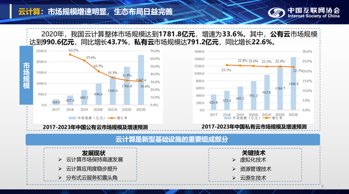 2020年云计算市场保持高速发展,整体市场规模达到了1781亿元,增速超过33%,其中公有云市场规模继续扩大,但增速放缓,预计到2030年将超过2000亿元。私有云的市场规模也同样持续扩大,增速平稳,去年达到了791.2亿元,同比增长22.6%。