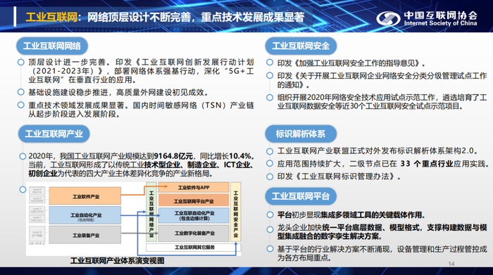 2020年我国工业互联网产业规模达到9164.8亿元,截至今年六月份,已有五个国家顶级节点平稳运行,两个灾备节点已经启动建设,标识注册量超过了229亿。二级节点共计155个,覆盖了25个省级行政区,包括船舶、集装箱、汽车、石化、视频、医疗器械等30多个行业,接入工业互联网标准解析体系的企业17140家。