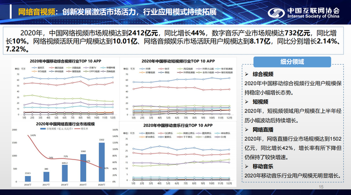 2020年中国互联网网络音视频规模达到了2412亿元,我国网络音视频用户规模持续增长。网络音视频市场依托技术升级、用户代际更替、消费模式转换等变量推动,产业效能持续提升,网络直播规模持续增长,技术和商业模式持续拓展。