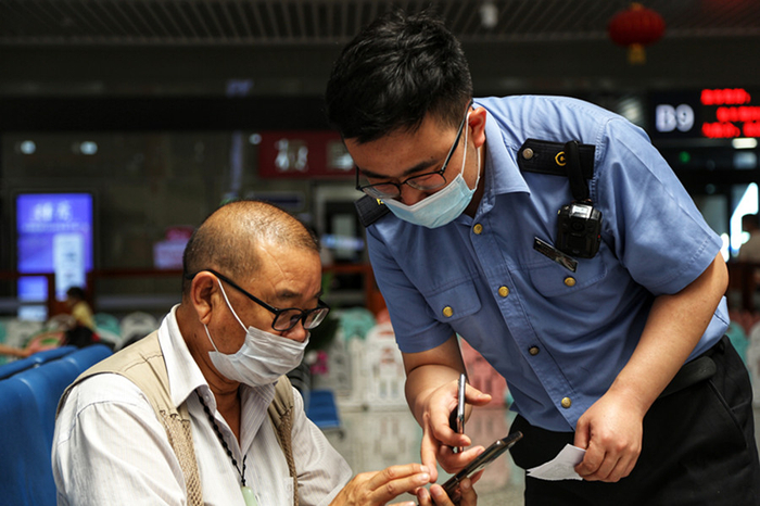 乌鲁木齐站“丝路明珠”重点旅客专区客运员蒋旭亮正在帮助脱网老人办理车票改签业务。陶令伟摄 央广网发
