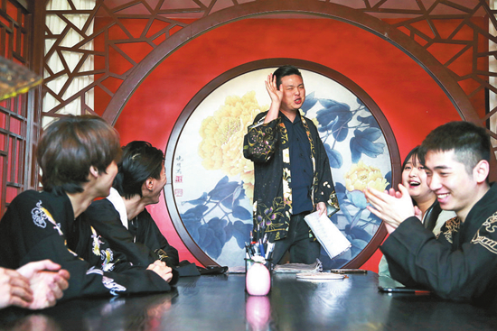3月22日,在陕西省西安市一处“剧本杀”门店内,剧本“主持人”在向玩家讲解剧情。视觉中国供图