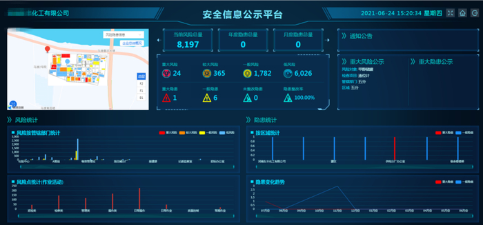 系统结合鑫安利具有知识产权的综合数据模型研究成果,自动对企业风险和隐患进行智能汇总分析,企业可以通过安全信息公示平台查看综合风险指数、风险统计柱状图、隐患统计柱状图及变化趋势,全面掌握企业整体安全状况,安全管理真正做到心中有数。