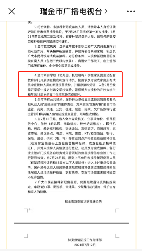 另外在安徽和江西,部分地方通知新学期开学要查验新冠疫苗接种证明。