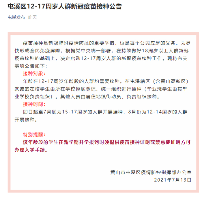 据安徽黄山市屯溪区官方消息,即日起至7月底为15-17周岁的人群开展接种,8月份为12-14周岁的人群开展接种。屯溪区特别提醒:该年龄段的学生在新学期开学报到时须提供疫苗接种证明或禁忌症证明方可办理入学手续。