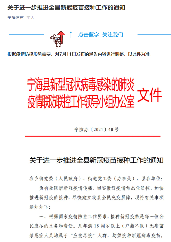 浙江省宁海县的通告内容引发舆论关注后,该县委外宣中心工作人员对央视网表示,目前执行的文件以宁海发布微信公众号7月12日发布的文件为准。新文件删除了“原则上不允许未接种新冠疫苗人员(禁忌症者除外)进入……重点场所”的表述。