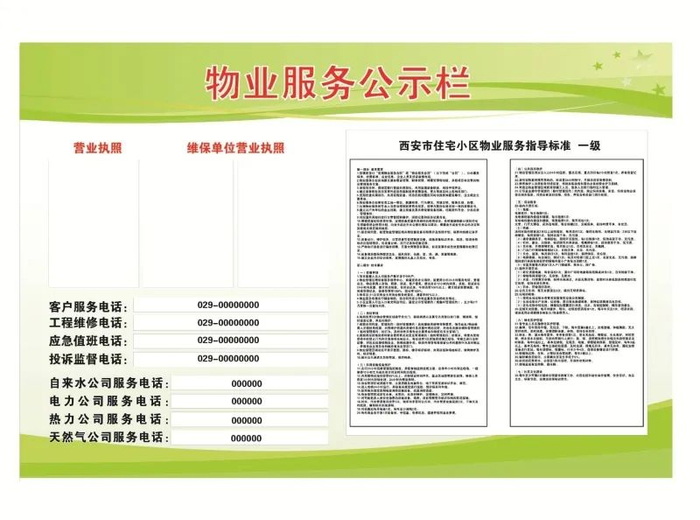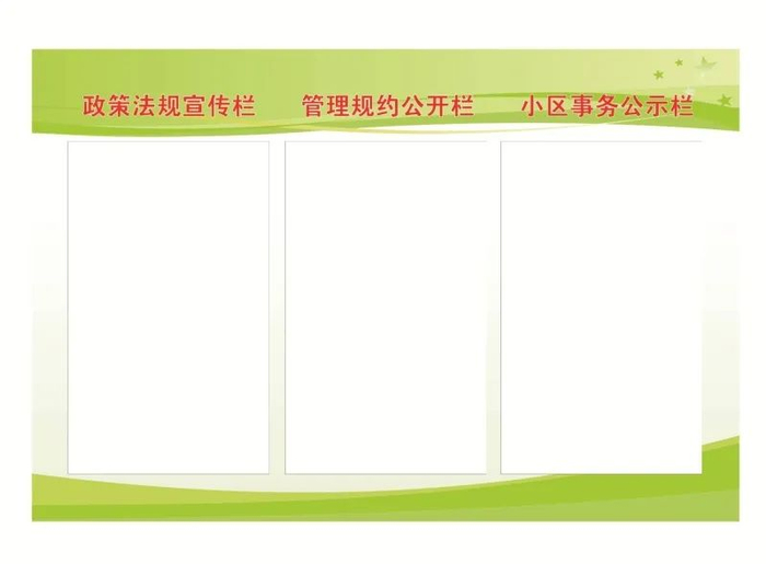物业服务公示栏。主要用于向业主公示物业服务企业营业执照、维保单位营业执照、物业服务等级和服务标准等信息。政策法规宣传栏。主要用于向业主宣传物业管理相关政策法规,物业服务企业结合小区实际,定期更换宣传内容,增强宣传针对性。管理规约公开栏。主要用于向业主公开住宅小区管理规约,要长期公示,便于业主了解掌握,自觉遵守执行。小区事务公示栏。主要用于公示第五至第十一项内容,以及需要告知全体业主的其他信息。