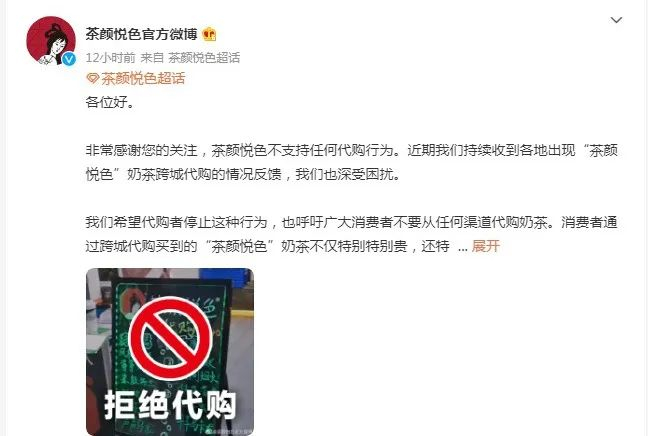 茶颜悦色通过微博呼吁广大消费者不要从任何渠道代购奶茶。消费者通过跨城代购买到的“茶颜悦色”奶茶不仅特别特别贵,还特别特别不好喝!