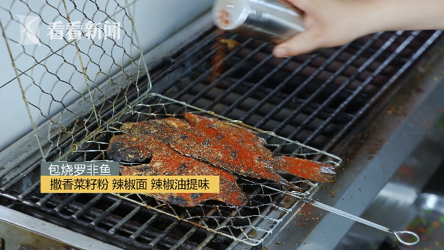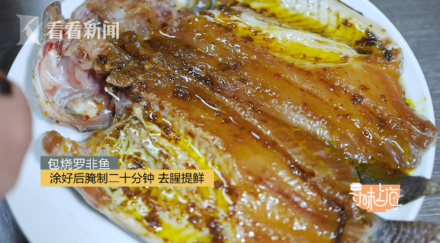 黄辣酱味辣且鲜甜,将它均匀涂抹在罗非鱼上,腌制20分钟,在去腥的同时,可以达到提鲜的目的。传统的包烧罗非鱼是将鱼涂满香料后直接包叶烧烤,但是这样常会出现外面叶子烧焦,但是鱼肉没熟的情况,于是云南大厨改良了做法,先把鱼烤制到半熟,再包芭蕉叶,这样可以在保证鱼肉全熟的情况下,又保持鱼肉的鲜嫩。烤鱼的时候需要不断翻面,让鱼肉不焦。