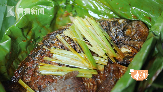香茅,因为有柠檬的味道,所以又叫柠檬草,是给鱼去腥的最好选择,香柳香气浓郁,可以提鲜,罗勒化食开胃,荆芥味道微辛,让人食欲大增。接下来就是包烧的的关键,将放好香料的罗非鱼用芭蕉叶包好,再次放到炉上,香料混合着芭蕉叶的清香,渗透进鱼肉中,产生了奇妙的味觉体验。