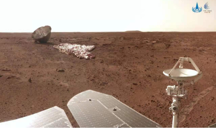 最新影像!“祝融号”近距离“看”降落伞与背罩。