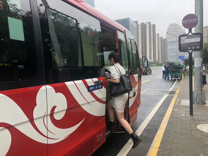 在望京地区的阜通地铁站等站点,巡游定制公交同样受到欢迎。“出了地铁还要走一公里,夏天又热又晒,要是穿裙子、高跟鞋,骑单车也不方便,不如坐巡游定制公交舒服,而且早高峰共享单车也抢不到。”赵梓寒在望京SOHO物业部门上班,如今已经成为巡游定制公交的“铁粉”。她打开手机上的“北京定制公交”APP告诉记者,线上“打公交”跟打网约车一样方便,提前一天就可以预约,如果忘了也可以在当天快出地铁时预约,一两分钟就能收到App和短信通知提醒,车来得也很快。