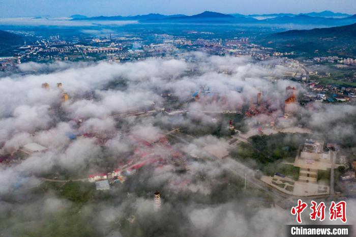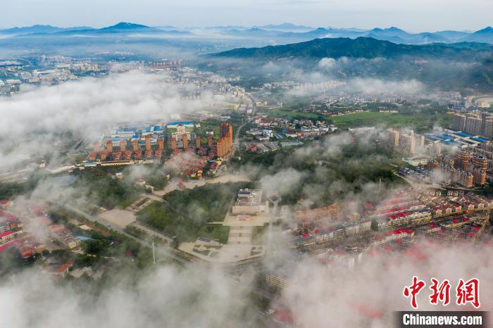 7月16日清晨,江西省瑞金市上空雨后出现平流雾,城市若隐若现,给这座"红色故都"增添美丽色彩,也给酷暑中的人们送来难得的清凉天气。