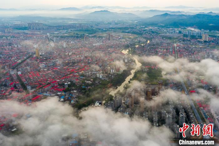 7月16日清晨,江西省瑞金市上空雨后出现平流雾,城市若隐若现,给这座"红色故都"增添美丽色彩。 马刚 摄