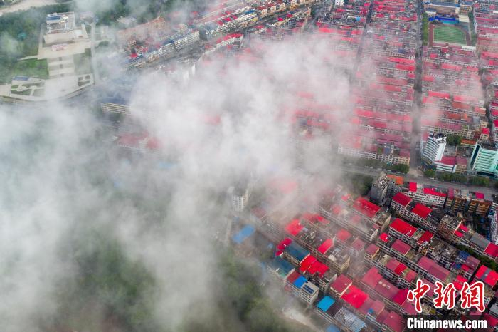 7月16日清晨,江西省瑞金市上空雨后出现平流雾,城市若隐若现。 马刚 摄