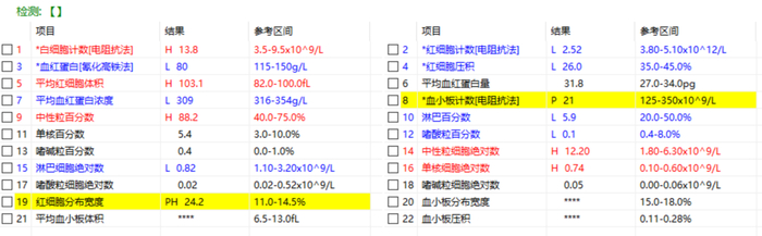 血小板减少(PLT项出现“L”或者“↓”)