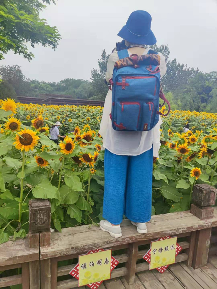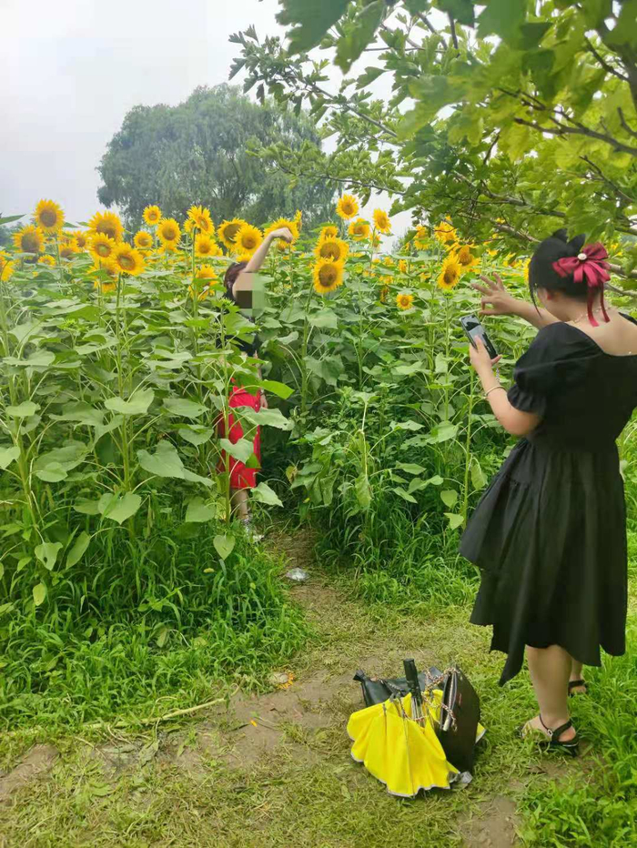 从北园西门进门右转,沿着水边直行5至8分钟,即可看到大片的向日葵在夏日的阳光下随风摇曳。园中游客络绎不绝,有带着一家老小来游玩的,有专门约摄影师来拍艺术照的,有现场直播逛花田的……