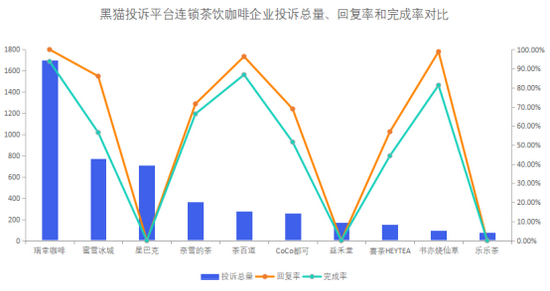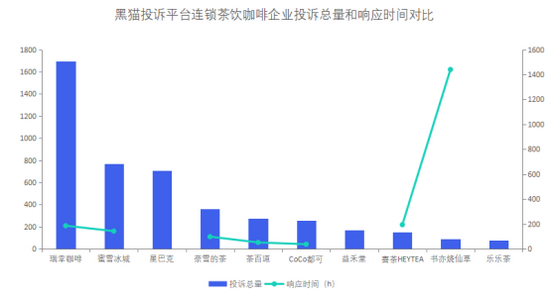 黑猫投诉连锁茶饮咖啡企业投诉数据对比:星巴克和益禾堂回复率较差