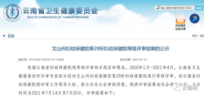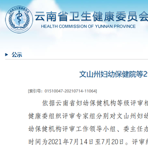 依据云南省妇幼保健机构等级评审相关规定和要求,2020年1月-2021年4月,云南省卫生健康委组织评审专家组分别对文山州妇幼保健院等29所妇幼保健院进行等级评审。经云南省妇幼保健机构评审工作领导小组、委主任办公会审核同意,现将评审结果向社会进行公示,公示时间为2021年7月14日至7月20日。评审结果如下: