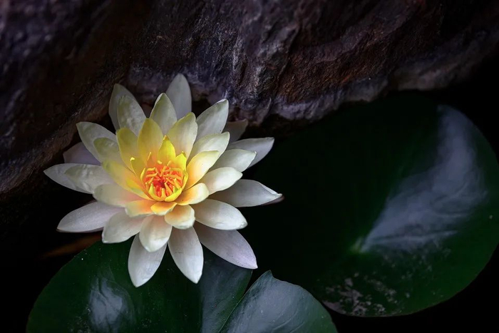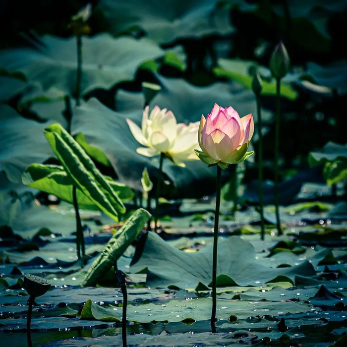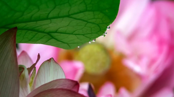 晶莹的水珠凝结在荷叶的边缘,光影之下,荷花紧紧依偎着碧绿滚圆的荷叶。