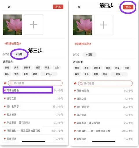 5.点击“#话题”,选择#荷塘映花色——第三届随拍荷花大赛#;