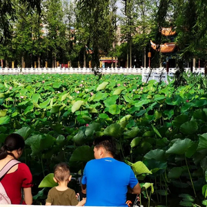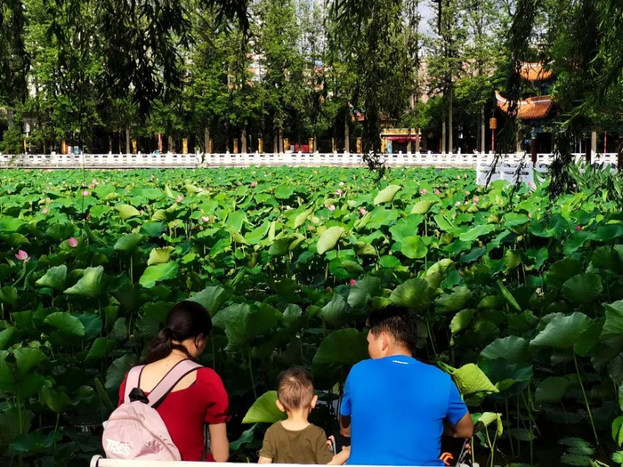 一家三口,坐在翠湖边,静静赏荷。