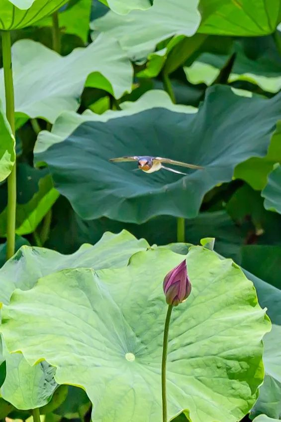 小鸟轻轻掠过含苞待放的荷花。