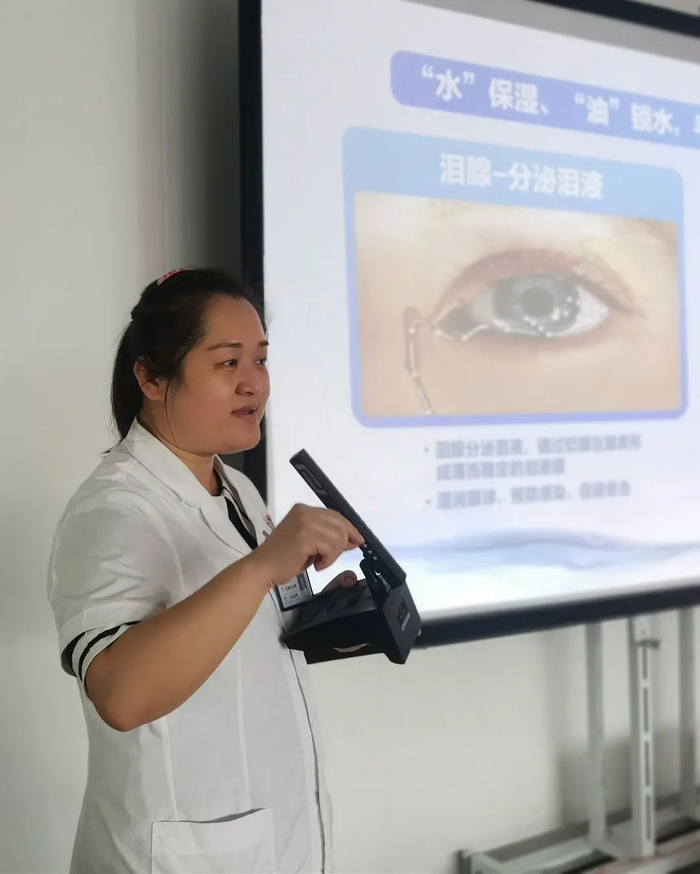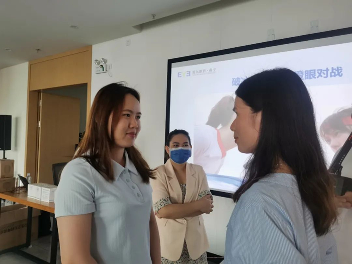 在眼健康公益讲座中最有趣的就是“干瞪眼”游戏环节,积极参与游戏获胜的人都可以获得爱尔眼科送出的眼部护理礼包。游戏前主持人让两名职工面对面站好,随着主持人宣布游戏开始,双方互相瞪着眼睛看着对方,先眨眼的一方判负。游戏总是安静的开始,在欢笑中结束。“眼睛变模糊了”,在被提问到 “干瞪眼”时有什么感受时,一位员工说。通过“干瞪眼”游戏,尹医师讲解了眼部的结构以及干眼形成的原理。