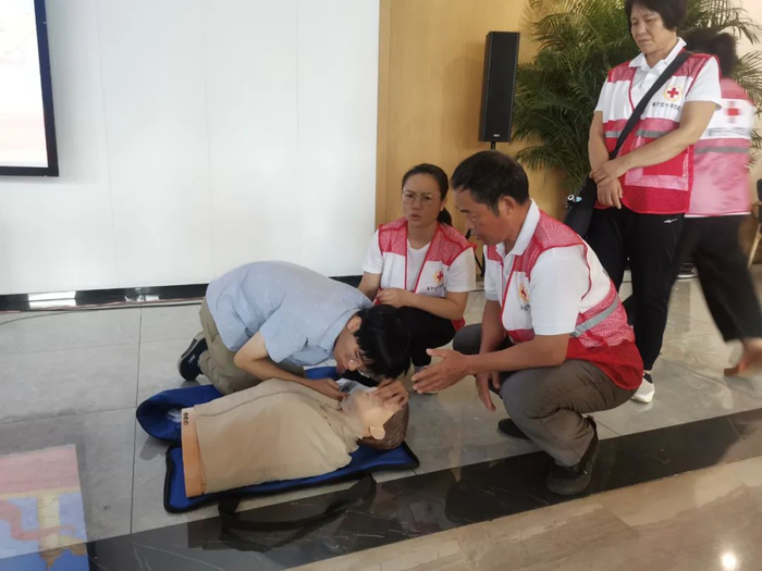 在做完眼部检查之后,员工们还参加了应急救护培训。在培训过程中,讲师给员工们耐心讲解并演示了心脏复苏、气道异物梗阻、外伤止血包扎等急救处理方法,同时员工们也积极主动参与到其中,通过实际操作来更好地掌握这些急救技巧。如在讲解心脏复苏时,让大家自己动手实践,利用假人来学习心脏复苏技术。