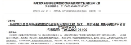 据京昆高速铁路西昆有限公司7月14日发布的《新建重庆至昆明高速铁路宜宾至嵩明段站前工程施工(单价承包)招标资格预审公告》显示,渝昆高铁宜宾至昆明段计划2021年9月1日开工,2027年8月31日竣工,工期6年。建设地点为四川省宜宾地区,贵州省毕节地区,云南省昭通、曲靖、昆明地区。建设线路自重庆西站引出,经重庆市江津区、永川区,四川省泸州市、宜宾市,贵州省毕节市,云南省昭通市、曲靖市,终至昆明南站。