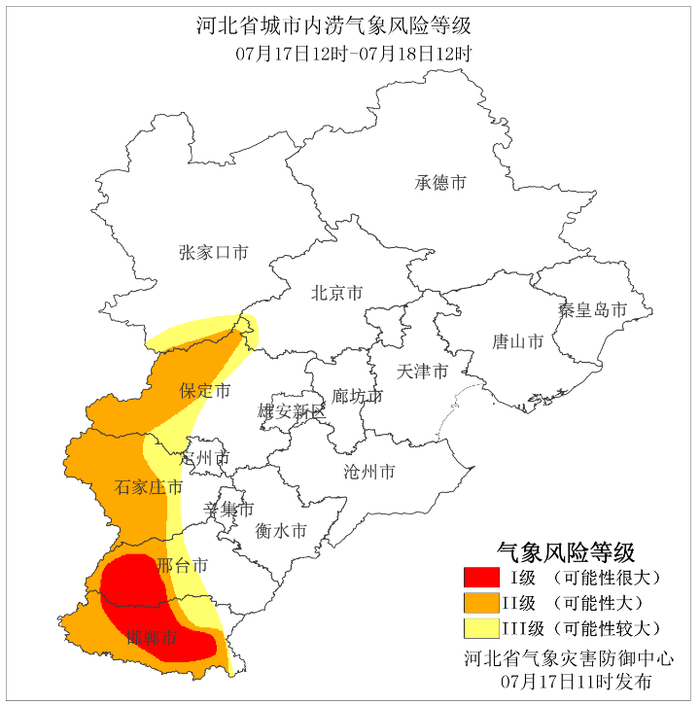 2021年7月17日12时至18日12时河北省城市内涝气象风险等级预报。