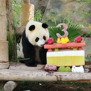据悉,三岁的七七好比人类的“花季少女”。对于“吃货”七七来说,面前的美食最重要,刚刚还迈着优雅的小步伐的七七,看到“生日蛋糕”后一路小跑,利落地一把揪起最爱的笋,一屁股坐下就“开动”起来,惹得现场的围观游客不时地发出阵阵笑声。