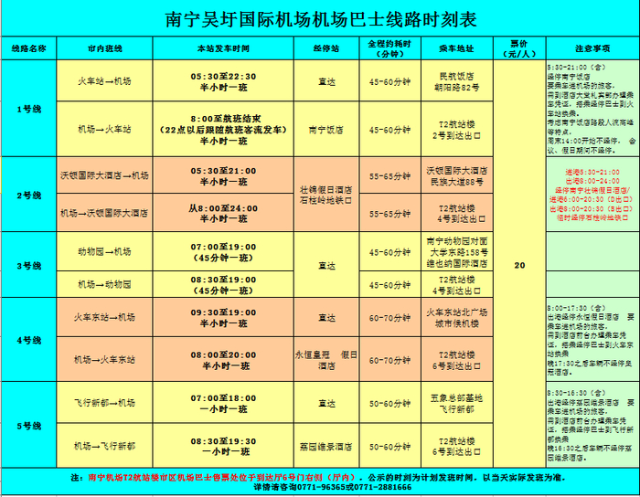 在发班时刻方面,南宁机场巴士5号线由五象总部基地(飞行新都)至南宁机场的发班时刻为07:00至18:00,每小时一班;南宁机场至五象总部基地(飞行新都)的发车时间为08:30至19:30,16:30前(含)发班车辆经停荔园维景酒店。