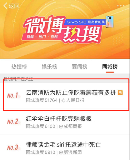 冲上微博同城热搜榜
