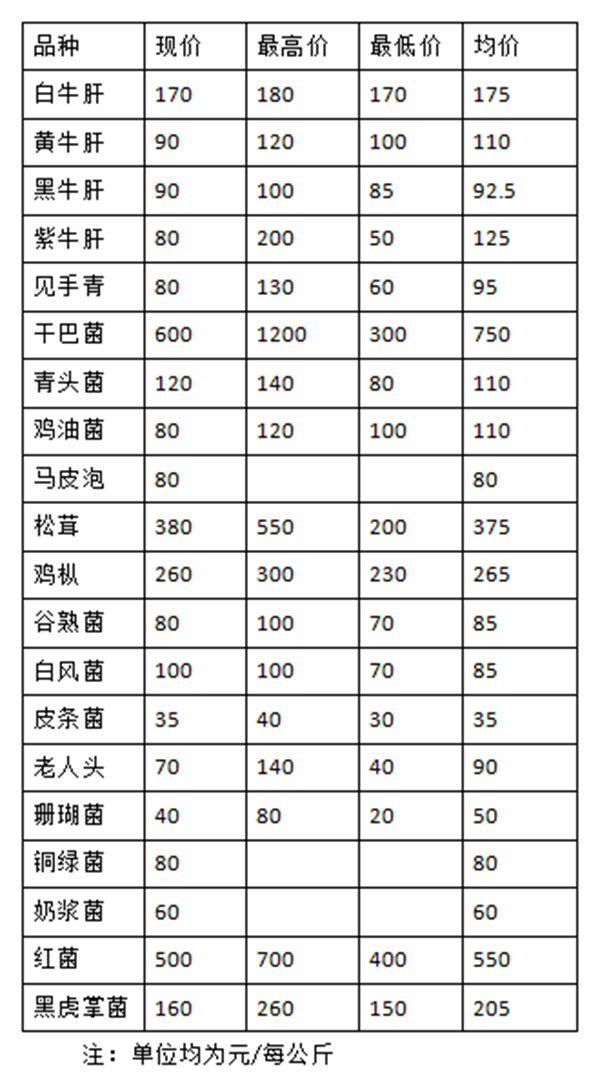 野生菌价格表