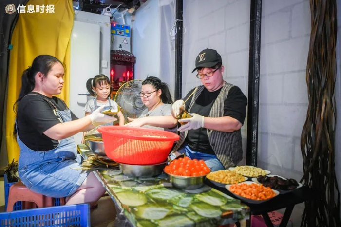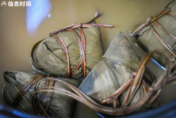 不过,判断其是否是正宗的台山粽,除了口感和形状外,馅料里是否加入“红榄”才是关键。据悉,除了绿豆、咸蛋黄、花生等基础食材外,加工五花肉时需要加入“红榄”腌制。“将红榄洗干净切碎,将五花肉腌入味,不仅能让花肉更香,颜色也会更好看。”罗建忠说。喜欢吃粽子的人虽然不在少数,但也有很多人对粽子里面的五花肉“敬而远之”。为了减轻五花肉的油腻感,罗建忠说,他们煮粽时,还会特意放入艾草和菖蒲。