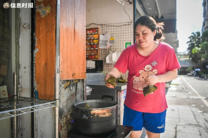 说起“全恩粽”的由来,老板娘邓惠方表示,她和丈夫是2004年起在这里开店的。“我们都是恩平人,‘全恩粽’这个名字,是从丈夫莫国全的名字中摘取的。”当年,夫妻俩在东山口不足4平方米的小店,白天包粽子,晚上煮粽子,二十多年来没有睡过一个整觉。“煮粽时,每隔两三小时就要翻动一下,让它均匀受热。”
